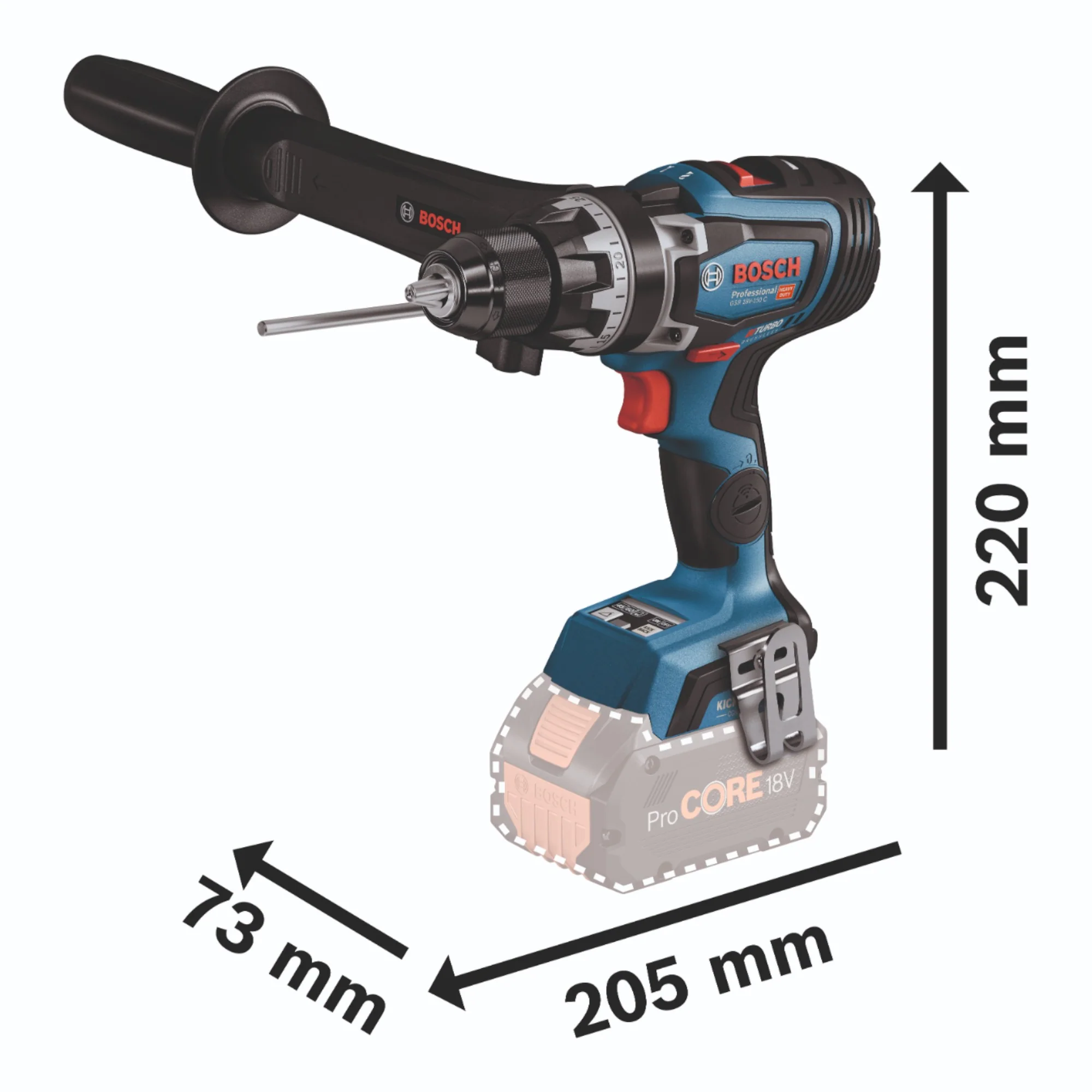 Der Bosch GSR 18V-150 C Professional Akku Bohrschrauber besticht durch seine 150 Newtonmeter Drehmoment gepaart mit der Biturbo Technologie. Des Weiteren besitzt er die präzise Electronic Angle Detection, diese gewährleistet bei langen Schrauben immer den richtigen Winkel. Darüber hinaus ist die KickBack Control verbaut. Das robuste Metallbohrfutter und Metallgetriebe versprechen eine lange Lebensdauer und viel Freude bei der Nutzung. Darüber hinaus ist das Bosch Connectivity Modul ( nicht im Lieferumfang ) kompatibel. Der GSR 18V-150 C Professional zeigt optimale Ergebnisse beim Schrauben und Bohren in Holz und Metall, besonders beim Bohren großer Durchmesser, z. B. Lochsägen bis 150 mm. Selbstverständlich ist eine LED Leuchte verbaut. Eines der Highlights der Maschine sind die drei Drehmomenteinstellungen. Diese sind im weichen Fall 84 Nm, im harten 100 und im Maximalbereich 150 Nm. Wichtig zu wissen: Biturbo Geräte müssen mit ProCore Akkus ab 5,5 Ampere betrieben werden. Bei kleineren Akkus ist die Performance des Gerätes lizenziert. Die Firma Bosch Professional ist ein führender Hersteller für Elektrowerkzeuge aller Art, der sich durch seine lange Tradition und seine hohe Verarbeitungsqualität auszeichnet.